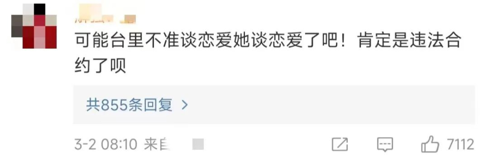 ▪️第一点,网友猜测可能台里不准谈恋爱她谈恋爱了吧!肯定是违法合约了!