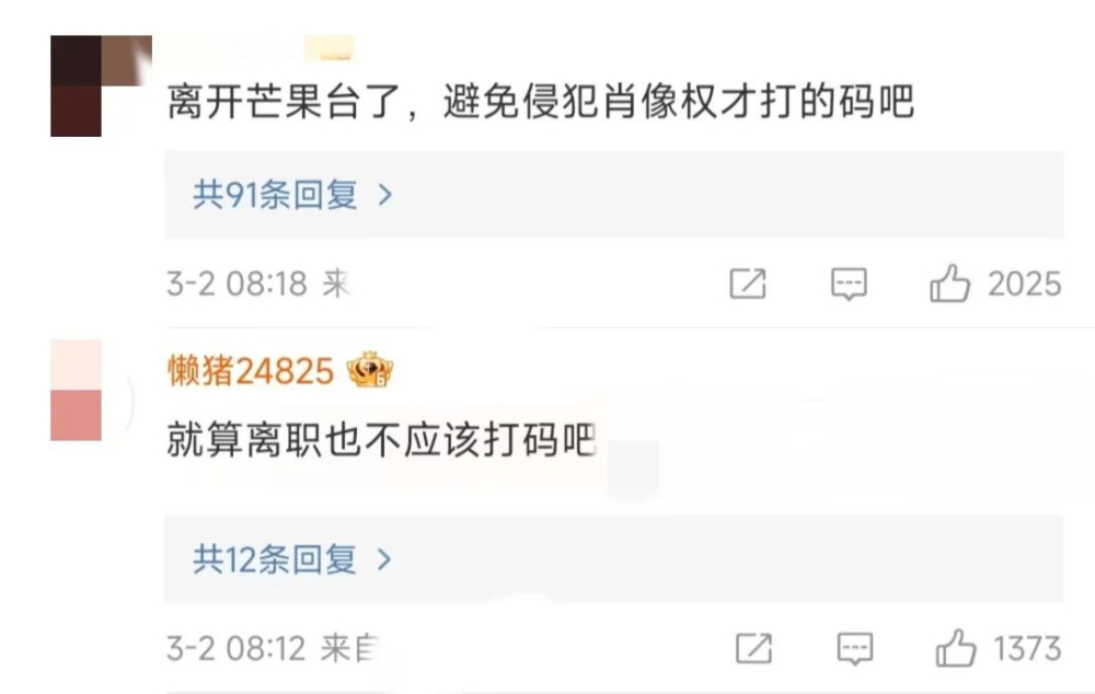 ▪️第四点,是因为肖像权才打的码,因为毕竟离开了芒果台。但有网友回复道,就算离职也不应该打码吧?