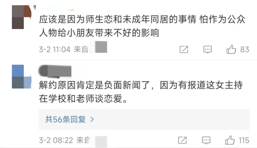 ▪️第三点,就是说应该是因为早前冯禧被曝师生恋和未成年同居的事情(想知道这个事情自行搜索...),怕作为公众人物给小朋友带来不好的影响、解约原因肯定是负面新闻了,因为有报道这女主持在学校和老师谈恋爱...