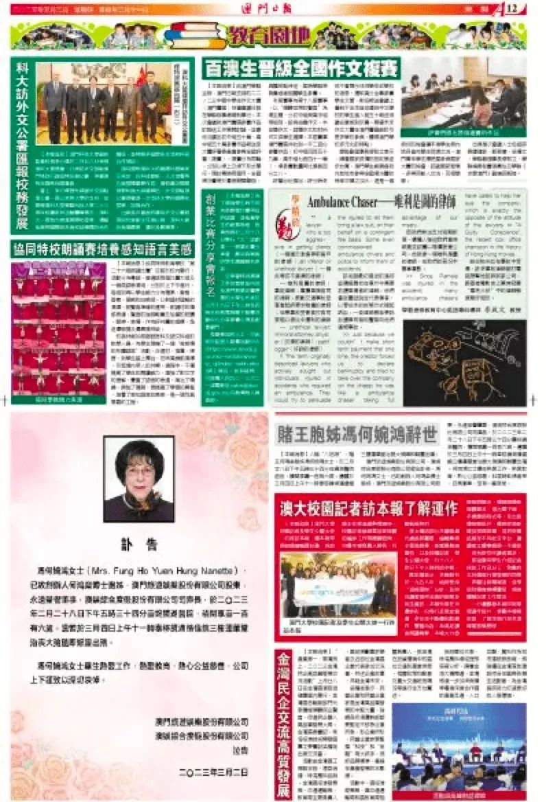 据了解,澳门旅游娱乐股份有限公司和澳娱综合度假股份有限公司还为此刊登报丧,表示何婉鸿遗体将于4日上午奉移殡仪馆治丧大殓,随即辞灵出殡。