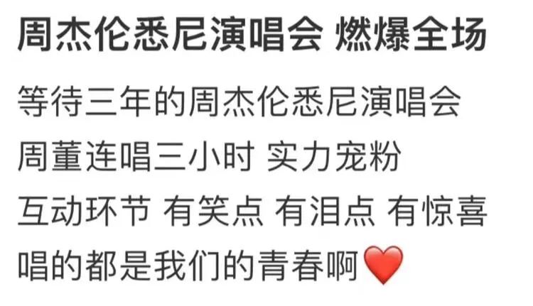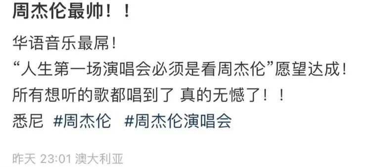 昨日,周杰伦“2023年嘉年华世界巡回演唱会”悉尼站开唱了,或是由于粉丝热情太高了,周杰伦为了让现场粉丝听过瘾,可谓是嗨唱整场!加码多首!一般演唱会都是两小时左右,周杰伦竟然连续唱了3个小时,50多首!