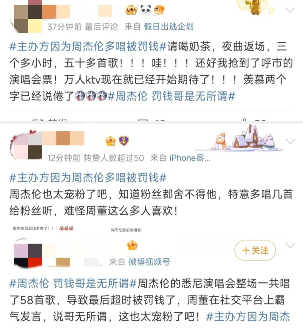 #主办方因为周杰伦多唱被罚钱#、#周杰伦 罚钱哥是无所谓#、#周杰伦演唱会请粉丝喝奶茶#...一大早就看到周杰伦因为演唱会超时唱歌被罚款的事情了,这到底发生了什么?!
