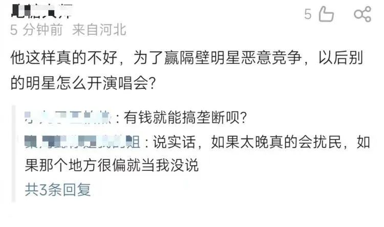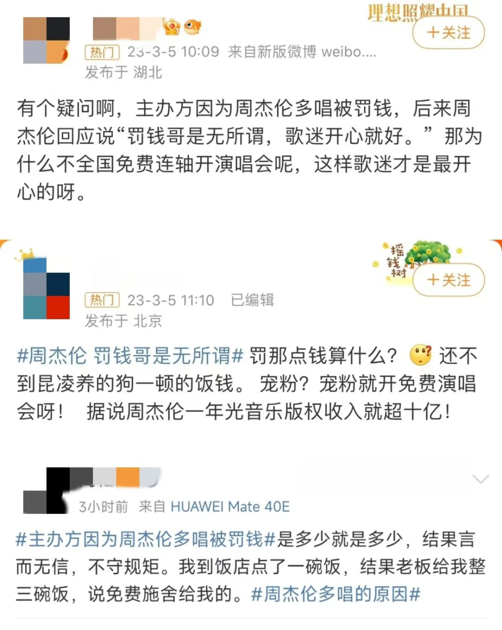 但与此同时也引来了不同的看法,不少路人认为他过于高调,不守规矩,有大v表示:“那为什么不全国免费连轴开演唱会呢,这样歌迷才是最开心的呀。”、“罚那点钱算什么? 还不如昆凌养的狗一顿的饭钱,宠粉就开免费演唱会呀! 据说周杰伦一年光音乐版权收入就超十亿!”、“说多少就是多少,结果言而无信,不守规矩”、“为了赢隔壁明星恶意竞争,以后别的明星怎么开演唱会啊?”...