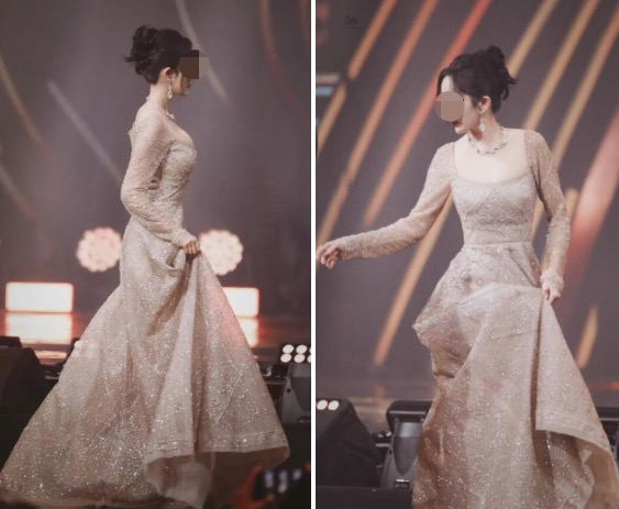 礼服面料选用的是那种略硬的薄纱材质作为设计,修身又收腰的长裙搭配上大裙摆,加之稍许亮闪的小金粉材质注入,除了能给整体裙装裙装添入不少的精致的美感外,更透露出一股华丽与高级感。