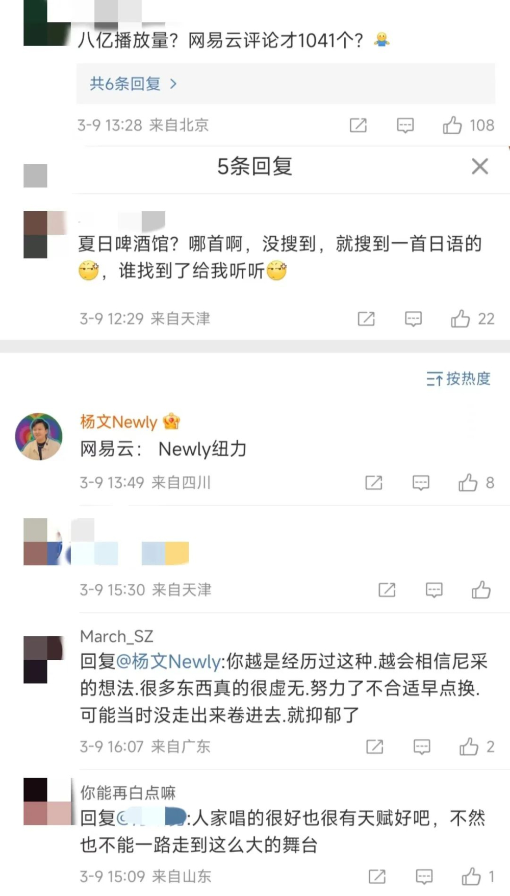 但是也有部分网友,对杨文采访中提到的自己原创8亿播放量的单曲,在某音乐平台上也仅有一千多条评论,对杨文提到的“8亿播放量”表示怀疑:“八亿播放量?网易云评论才1041个?”、“夏日啤酒馆? 哪首,没搜到,谁找到了给我听听”......对此,杨文本人现身回复评论:“网易云:Newly纽力”(去搜了一下是真的有这首歌的啦!)。