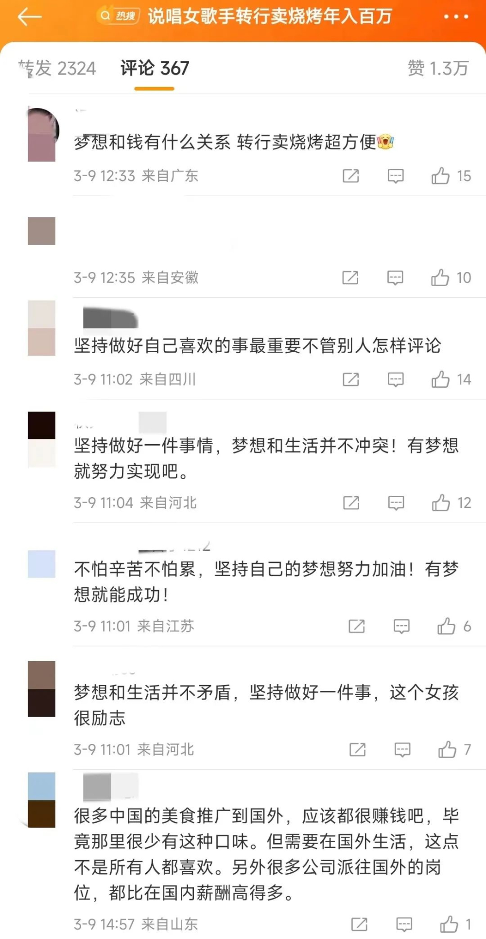 对此,许多网友的评论都好励志的,称道:“梦想和钱没有什么关系 转行卖烧烤超方便”、“坚持做好自己喜欢的事最重要不管别人怎样评论”、“坚持做好一件事情,梦想和生活并不冲突!有梦想就努力实现”、“不怕辛苦不怕累,坚持自己的梦想努力加油!有梦想就能成功!”、“梦想和生活并不矛盾,坚持做好一件事,这个女孩很励志”......