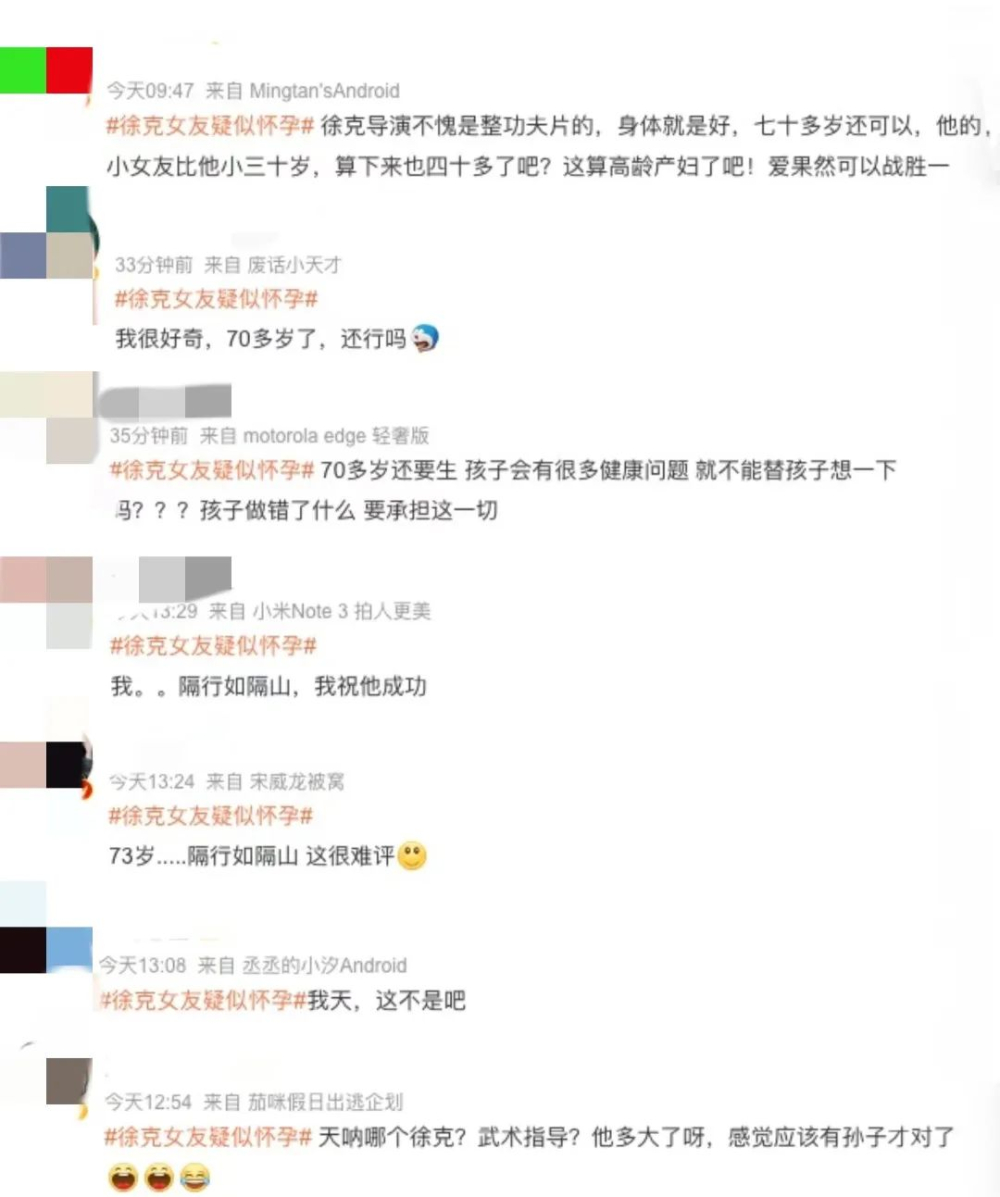 关于徐克女友乐乐疑似怀孕一事,网友议论颇多,但主要还是感比较惊讶,徐克今年已经73岁了,而他女友就算比他小30岁,今年也有40多了,算得的上是高龄产妇了,如果真的是怀孕了,那便是老来得子了,属实不易。但也有网友称:“70多岁还要生,孩子会有很多健康问题的,就不能替孩子考虑一下?孩子做错了什么,还要承担这一切...”
