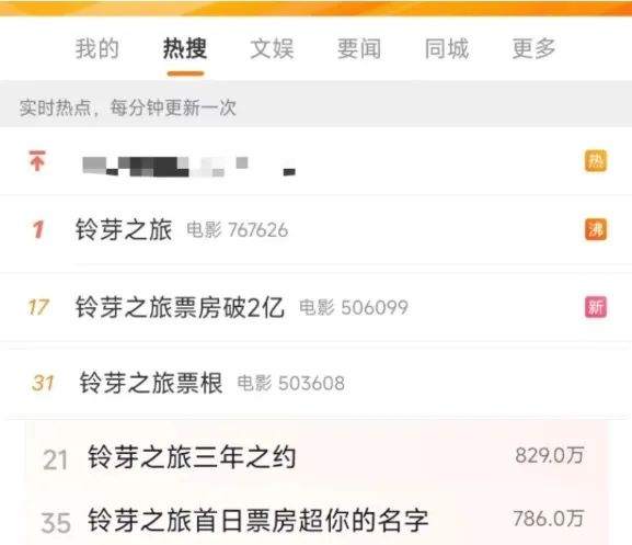#铃芽之旅#、#铃芽之旅票房破2亿#、#铃芽之旅票根#、#铃芽之旅三年之约#、#铃芽之旅首日票房超你的名字#......除了当前正在进行的微博之夜,各社交平台热搜词条最多的当属电影《铃芽之旅》了!你们都有去看吗?!