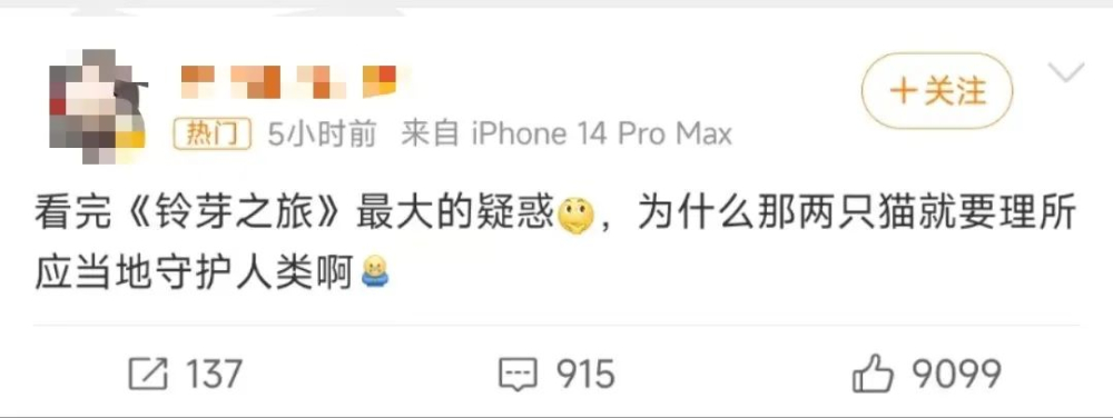 3月24日上午9点,日本著名动画电影导演——新海诚 全新力作《铃芽之旅》已经正式上映,登陆全国影院了!!该片各大电影网站均已高分开局——微博9.2、豆瓣7.9! 今日下午,#铃芽之旅#的搜索词条冲上了微博热搜榜TOP1,一时之间该影片瞬间沸腾起来了,各社交平台上相关搜索词条下都直接“杀疯”了!不少观众都在表示被看哭,称其真的十分治愈。
