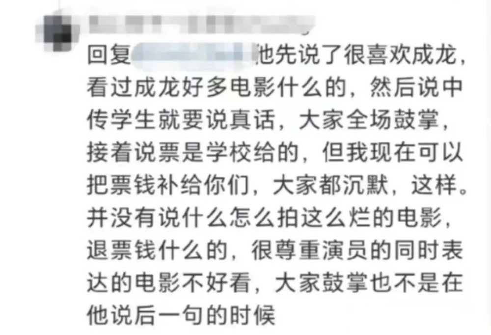 在听到网友这突然发问后,电影导演进行了道歉,成龙也表示:尊重大家的想法、虚心接受批评,大家是听到成龙和导演诚恳的回复后现场才热情鼓掌的!