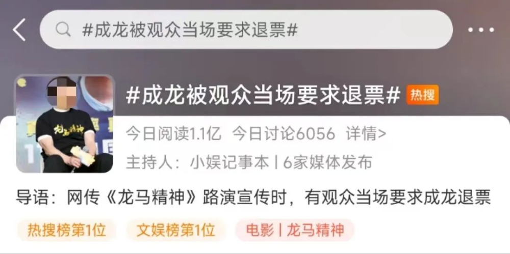 今日下午,搜索词条 #成龙被观众当场要求退票# 突然就冲上了微博热搜榜单TOP1 ,两个小时不到其话题阅读量直接高达1亿+次!其热度仍在不断攀升中!
