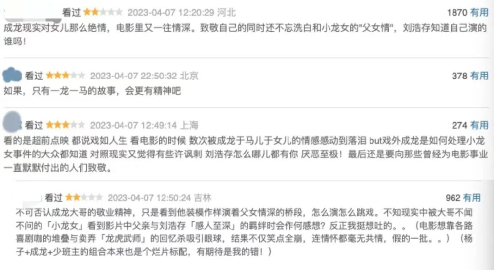 网友们对这部电影最争议的一个点,基本上都是影片中成龙与刘浩存演父女情深的戏份,大家都感觉无法代入,纷纷评论称道:👇