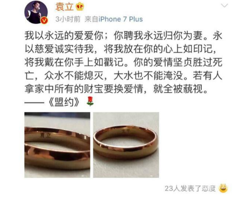 3月26日,袁立证实了婚姻新闻并宣称“夫妻不再是两个人,而是一体化”,但现在微博已被删除。