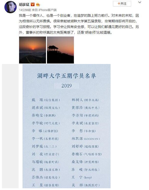 3月25日晚,以马云为首的湖畔大学公布了五期学员名单,其中包括明星胡彦斌等41名学生、优信集团创始人戴琨等41名学员。从去年8月启动报名,到12月完成初选与面访,再到1月初的集中面试,这41名学员从1400多位报名者中脱颖而出,赢得了学长与企业家面试官的一致认可。而胡彦斌则是首个被湖畔大学录取的音乐人。
