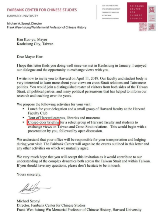 高雄市长韩国瑜表示应哈佛大学费正清中国研究中心邀请演讲,昨晚提前1天搭机访美,民运人士王丹却发文直指查不到韩赴哈佛演讲的公告,质疑「自行放话,根本就是唬烂」!市府稍后也秀出邀请函打脸,反批王「如同井底之蛙」,但王今(10)日凌晨再度回击「演讲和座谈都分不清的高雄市政府,傻傻的」、「明明是闭门座谈」、「刘姥姥进大观园就以为上天了,这才是井底之蛙吧」,有网友看出邀请函中确实载明「Closed-door briefing」(闭门简报)引发热议!