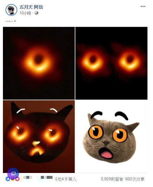 中研院昨(10)日公布第一波黑洞影像成果,也是史上第一张超大质量黑洞影像,而许多网友也守著直播,见证这历史性的一刻。而昨晚五月天主唱阿信,也在脸书分享「黑洞照」,但却KUSO将黑洞P图,P成黑猫的眼睛,让网友笑称,「亏你想的出来」、「别乱玩啦!」