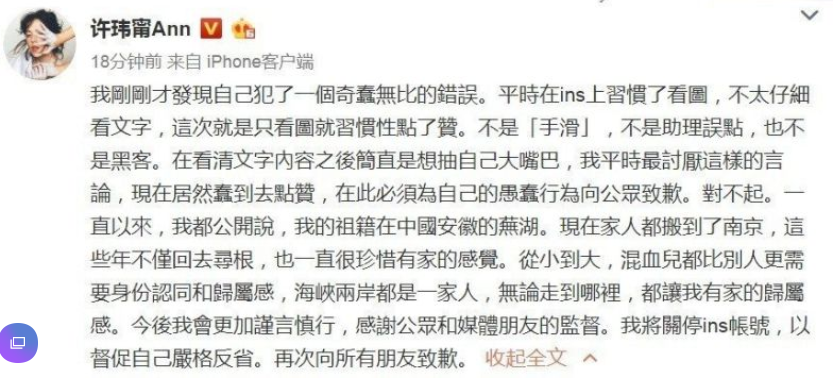许玮甯先是认错,「自己犯了一个奇蠢无比的错误」,表明自己平常习惯性点赞,只看图没注意看文字,「在看清文字内容之后,简直是想抽自己大嘴巴,我平时最讨厌这样的言论,现在居然蠢到去点赞,在此必须为自己的愚蠢行为向公众致歉。对不起。」随后她搬出祖籍动之以情,表明自己是混血儿,比别人更需要身分认同和归属感,「我的祖籍在中国安徽的芜湖。现在家人都搬到了南京,这些年不仅回去寻根,也一直很珍惜有家的感觉」。