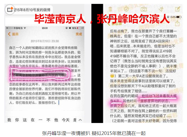 综合来看,这个借朋友小号来投稿的女子给北美吐槽君的投稿是2016年,但是毕滢其实在2015年就在微博里发布过这样的内容:“我总是会怀念,总是幻想如果能回到过去该有多好。比如回到大雪纷飞的东京街头,雅鲁藏布旁边的神秘墨脱,去年三亚的温暖冬天……南京和哈尔滨辗转五六次的飞机上”。而毕滢和张丹峰恰好就是2015年认识的,所以这位给“北美吐槽君”投稿的女子极有可能就是毕滢,毕竟有太多巧合了。