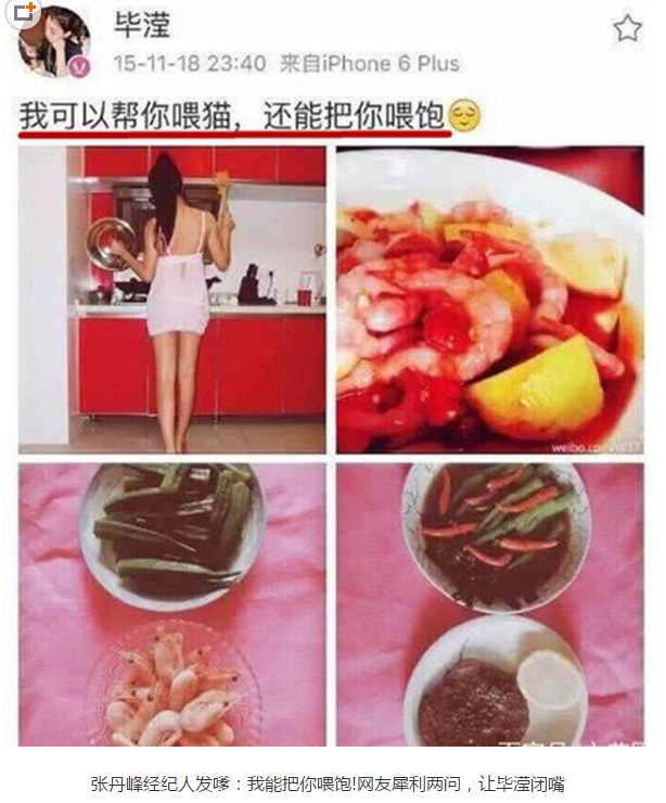 微博中的时间显示,当时已经是深夜11点40分,毕滢确实身着露背睡袍,背对着镜头正在做饭。配文显得非常有深意:“我可以帮你喂猫,还能把你喂饱!”这条微博被网友扒出并放在网上,引起关注此事的网友的议论,其中两个关键问题,吃惯群众特别想弄清楚。第一个问题:你能把谁的猫和谁喂饱?第二个问题:这么晚了,谁帮你拍的照片?这两个问题可谓犀利,有网友专门@了毕滢,但对方没有回应。网友猜测:“这两个问题让毕滢闭嘴了”不知道张丹峰有没有养过猫,如果有,这简直就是出轨实锤了!网友还扒出一张毕滢的睡袍照片,照片中毕滢穿着暴露,手拿两个鸡蛋,还煮这一大锅面,显然不是一个人能吃完的,同样是有人在给她拍照。网友直接留言到:“恶心!”
