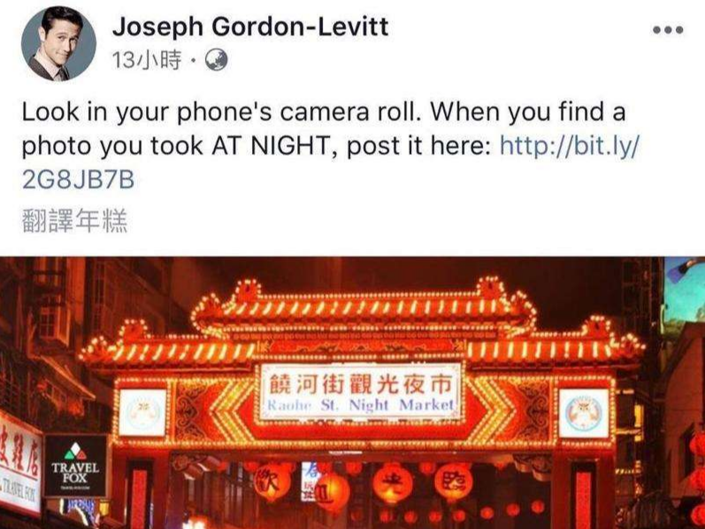 好莱坞男星乔瑟夫高登李维于12日在脸书贴出一张饶河街观光夜市牌坊的照片,还要粉丝「若你拍了夜景照片,请贴出来」,并给了粉丝一个网址,要大家踊跃分享照片。此举令人合理怀疑,乔瑟夫高登李维目前正在台湾!