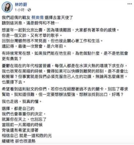 身为超偶学姐的林吟蔚在得知蔡东儒过世的不幸消息后,在脸书发长文悼念,「祝福你,下次会更坚强一点,到那边之后。别忘了继续用吉他和歌声,温暖这个世界上的悲伤。We‘ll miss you.」言语间满是错愕与不捨,透露自己与蔡东儒最后一次见面是在6年前的聚会上,更难过地表示如果自己能他生前为他做点什么?是不是他就会更有勇气。