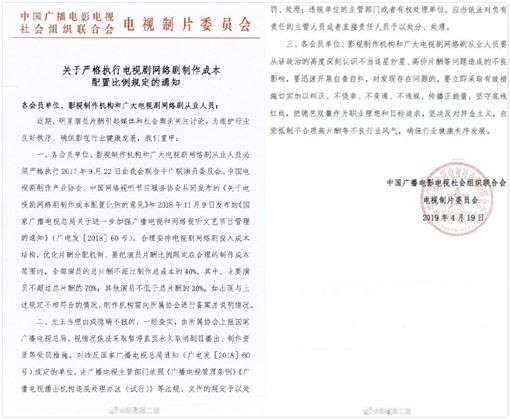 随后广电局电视製片委员会也重申下令,「严格执行电视剧网络剧製作成本配置比例规定」,全部演员总片酬不超过总成本40%;其中主要演员片酬不超过总片酬的70%、其它演员片酬不低于总片酬的30%,放话「无正当理由或隐瞒不报的,一经查证,由所属协会上报国家广播电视总局,视情况依法採取暂停直至永久取消剧目播出、製作资质等外处措施。」