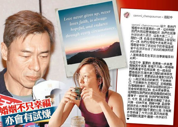昨日传出事件爆发后有人曾出面要求Sammi出声或发声明为安仔说好话,因安仔工作全面叫停,很大机会一铺清袋,希望她睇在夫妻情谊份上表态维护老公,不过,极度失望及痛心的Sammi仍然封闭自己,未肯原谅。在传言满天飞之际,Sammi昨午约4时半终打破沉默,首度就事件发声。她在社交网上载一张曙光初现的照片,并引用圣经哥林多前书第13章7节的经文「Love never gives up, never loses faith, is always hopeful, and endures through every circumstance.」(凡事包容,凡事相信,凡事盼望,凡事忍耐。)来表达已原谅老公,并撰长文讲解事件曝光后与安仔如何渡过这个艰难时刻。