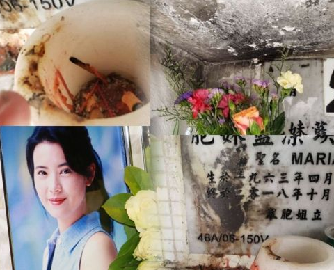 有「靓绝五台山」之称的蓝洁瑛去年11月倒毙寓所内,终年55岁。生前为天主教徒的她在教会安排下,骨灰安放于长沙湾天主教坟场。但有网民昨在微博上载了蓝洁瑛墓碑的照片,可见有人将用来摆放鲜花的白色小花瓶,用作燃烧香烛,致蓝洁瑛的墓碑及附近牆身被熏黑!