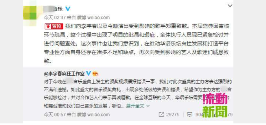 24日凌晨,颁奖礼的主办方在微博上向李宇春及受到影响的歌手表示道歉。活动主办方称,因为稽核环节的疏漏所以导致了李宇春事件的发生,并称全体执行人员都已经进行了「紧急检讨」,并就问题进行了查处。