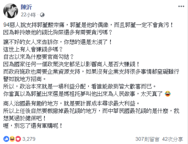 网路红人「馆长」陈之汉日前坦言郭台铭是自己的偶像,并称郭董「钱比狗屎还多」一定不会贪污。陈沂则在脸书发文暗酸馆长「你想的还是太浅了!」毕竟「这世上有人会嫌钱多吗?」